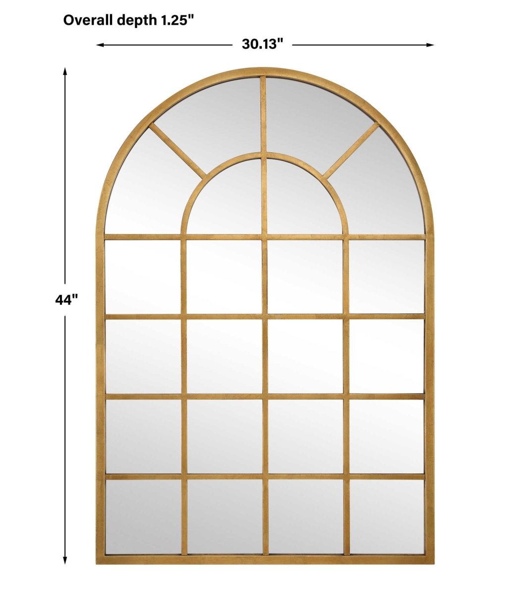 Finished in a gold leaf, this metal, arched windowpane frame will add interest to any space.