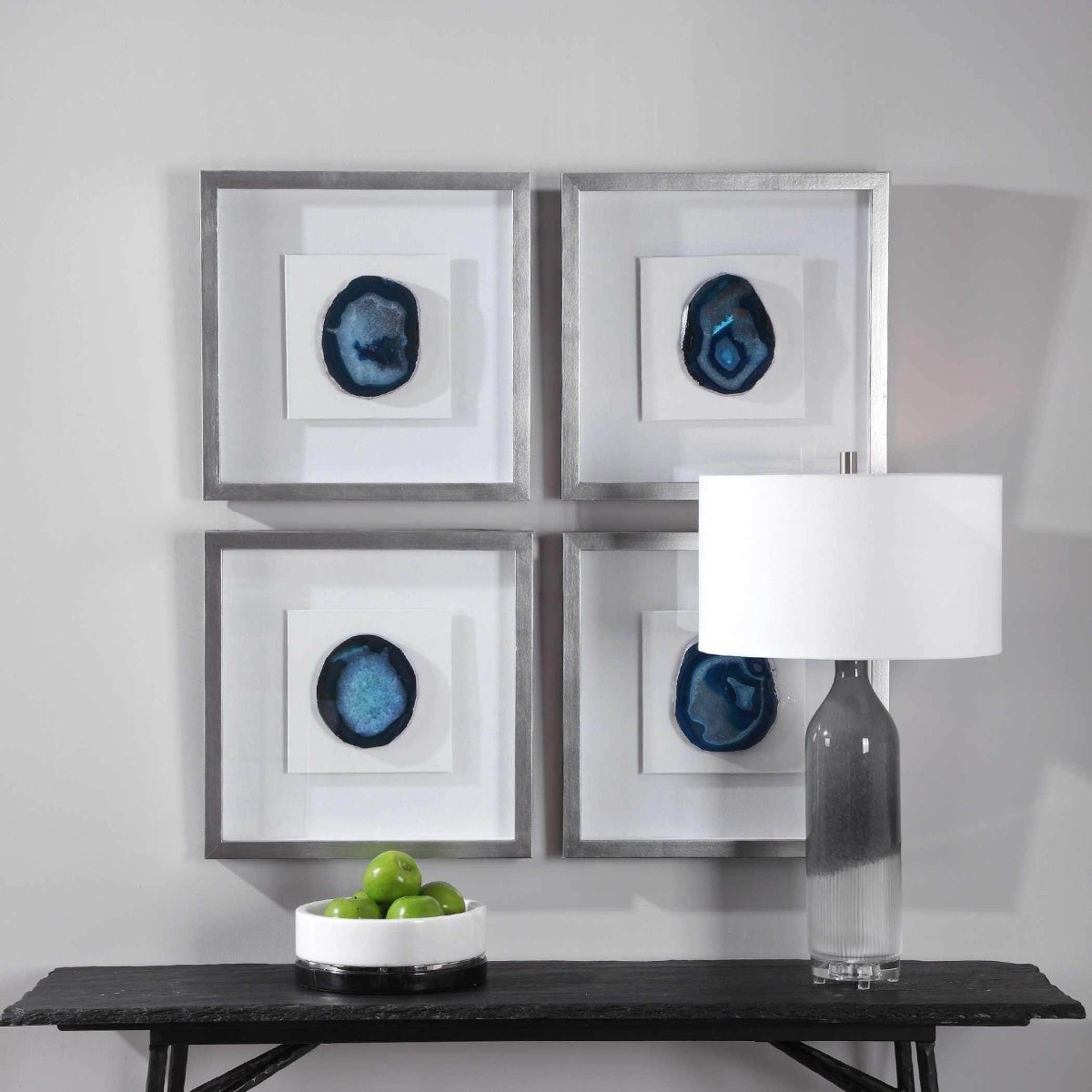 A pine wood shadow box featuring a hand applied silver leaf finish showcases a striking blue agate stone named Kalia with light blue veining, accented with hand painted silver edging. Mounted on a white linen backing.